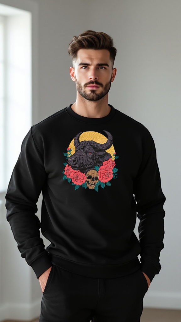 Haftowana bluza z motywem byka . Nowoczesna bluza, której nie znajdziesz w żadnym sklepie. Wyróżnij się na tle innych i ciesz się trwałością haftu przez długie lata.